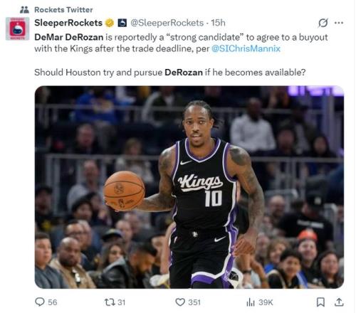 這場(chǎng)比賽之前,《體育畫報(bào)》記者克里斯-曼尼克斯透露,如果在交易截止日前無(wú)法把德羅贊交易出去,國(guó)王會(huì)裁掉德羅贊。在國(guó)王裁掉德羅贊后,洛杉磯快船、洛杉磯湖人會(huì)對(duì)他有意。休斯頓媒體也希望火箭可以追逐一下被買斷后的德羅贊。